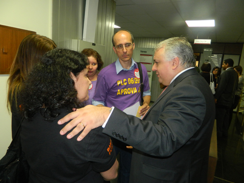 Já no plenário, no fim da tarde, Capez anunciou uma sessão extraordinária para votação do PLC 49/2014 e comprometeu-se a colocar o PLC 06/2013 em votação na próxima terça-feira (02/06). Questionamos das galerias o porquê de o nosso projeto só ser votado depois do outro, de interesse do Tribunal de Justiça, que beneficiará os magistrados e que certamente terá impacto orçamentário maior que o nosso. Deputados da oposição reforçaram este questionamento em seus discursos, sinalizando que pretendiam obstruir a votação do PLC 49. Capez foi taxativo em dizer que este tinha sido o acordado e que “quem obstruísse o 49 estaria automaticamente obstruindo a votação do 06”.
